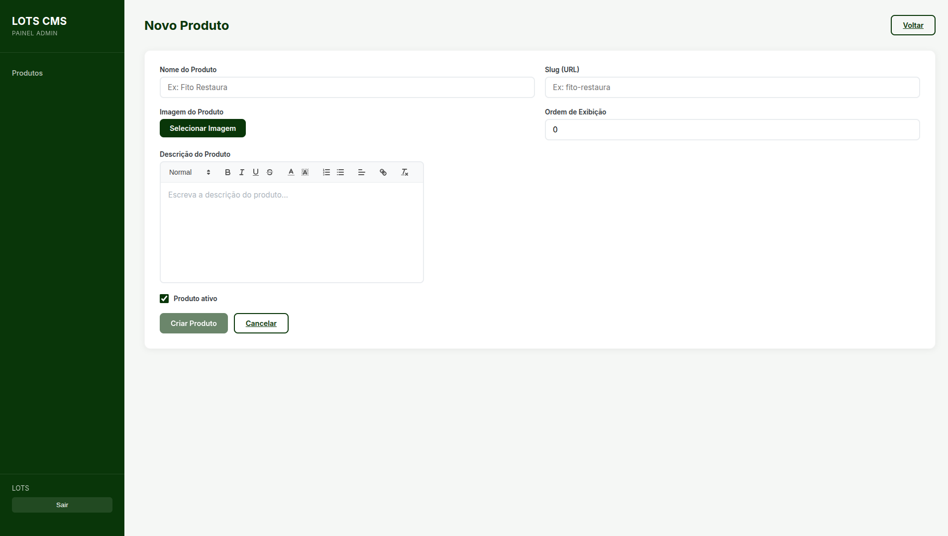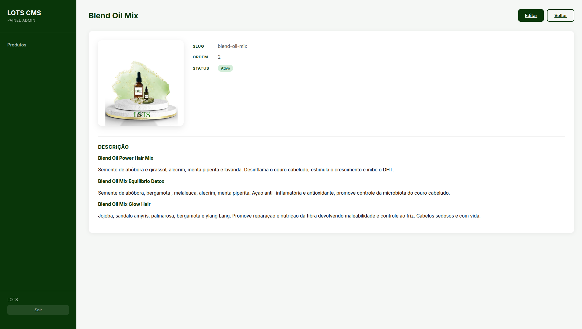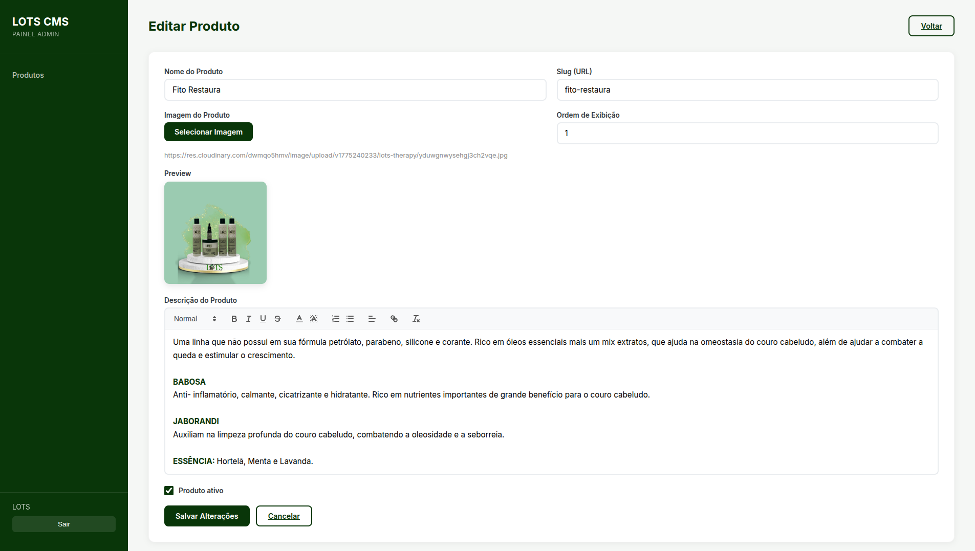 Descrição: Sistema de gerenciamento de conteúdo (CMS) de cadastro e edição de produtos desenvolvido com Angular e SpringBoot para o catálogo do site Lots Therapy.
